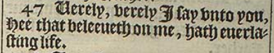 47 Uerely, verely I say vnto you, Hee that beleeueth on me, hath euerlasting life.