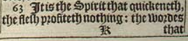 63 It is the Spirit that quickeneth, the flesh profiteth nothing: the wordes that I speake vnto you, they are Spirit, and they are life.
