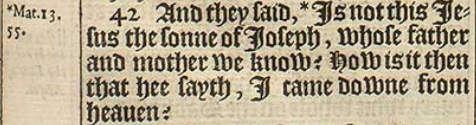 42 And they said, *Is not this Iesus the sonne of Ioseph, whose father and mother we know? How is it then that hee sayth, I came downe from heauen?[*Mat.13.55.]