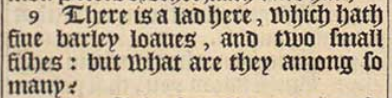 9 There is a lad here, which hath fiue barley loaues, and two small fishes: but what are they among so many?