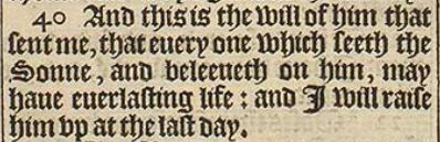 40 And this is the will of him that sent me, that euery one which seeth the Sonne, and beleeueth on him, may haue euerlasting life: and I will raise him vp at the last day.
