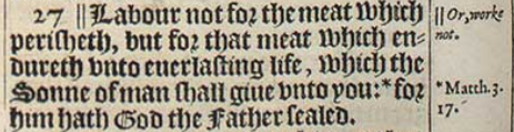 27 ||Labour not for the meat which perisheth, but for that meat which endureth vnto euerlasting life, which the Sonne of man shall giue vnto you: *for him hath God the Father sealed.[||Or, worke not. , *Matth.3.17.]