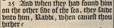 25 And when they had found him on the other side of the sea, they saide vnto him, Rabbi, when camest thou hither?
