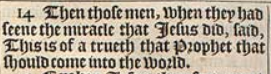 14 Then those men, when they had seene the miracle that Iesus did, said, This is of a trueth that Prophet that should come into the world.