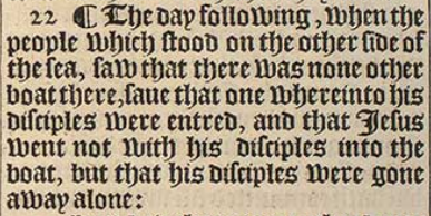 22 ¶ The day following, when the people which stood on the other side of the sea, saw that there was none other boat there, saue that one whereinto his disciples were entred, and that Iesus went not with his disciples into the boat, but that his disciples were gone away alone: