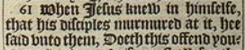 61 When Iesus knew in himselfe, that his disciples murmured at it, hee said vnto them, Doeth this offend you?
