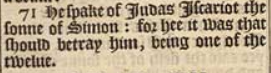 71 He spake of Iudas Iscariot the sonne of Simon: for hee it was that should betray him, being one of the twelue.