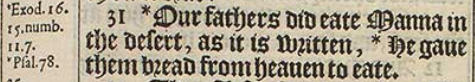 31 *Unsere Väter aßen Manna in der Wüste, wie geschrieben steht *'Er gab ihnen Brot vom Himmel zu essen.'"[*Exodus 16:15 Nummern 11:7 *Psalmen 78:25]