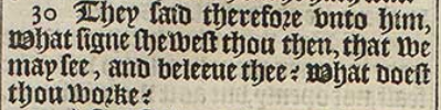 30 They said therefore vnto him, What signe shewest thou then, that we may see, and beleeue thee? What doest thou worke?