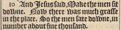 10 And Iesus said, Make the men sit downe. Now there was much grasse in the place. So the men sate downe, in number about fiue thousand.