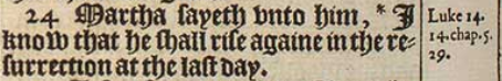 24 Martha sayeth vnto him, *I know that he shall rise againe in the resurrection at the last day. [ *Luke 14.14. chap.5. 29. ]