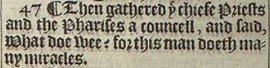 47 ¶ Then gathered þe chiefe Priests and the Pharises a councell, and said, What doe wee? for this man doeth many miracles.