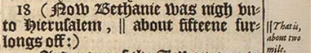 18 (Now Bethanie was nigh vnto Hierusalem, || about fifteene furlongs off:)[||That is, about two mile.]