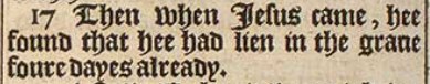 17 Then when Iesus came, hee found that hee had lien in the graue foure dayes already.