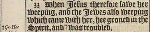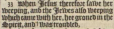 33 When Iesus therefore sawe her weeping, and the Iewes also weeping which came with her, hee groned in the Spirit, and +was troubled,[+Gr. Hee troubled himselfe.]