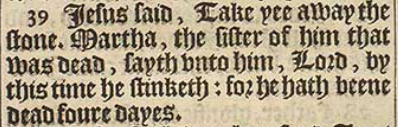39 Iesus said, Take yee away the stone. Martha, the sister of him that was dead, sayth vnto him, Lord, by this time he stinketh: for he hath beene dead foure dayes.