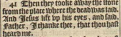 41 Then they tooke away the stone from the place where the dead was laid. And Iesus lift vp his eyes, and said, Father, I thanke thee, that thou hast heard me.