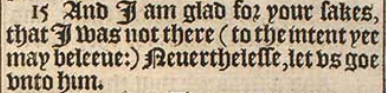 15 And I am glad for your sakes, that I was not there (to the intent yee may beleeue:) Neuerthelesse, let vs goe vnto him.