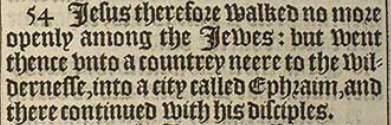 54 Iesus therefore walked no more openly among the Iewes: but went thence vnto a countrey neere to the wildernesse, into a city called Ephraim, and there continued with his disciples.
