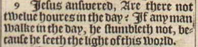 9 Iesus answered, Are there not twelue houres in the day? If any man walke in the day, he stumbleth not, because he seeth the light of this world.