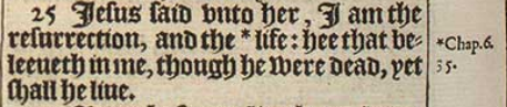 25 Iesus said vnto her, I am the resurrection, and the *life: hee that beleeueth in me, though he were dead, yet shall he liue.[*Chap.6.35.]