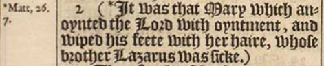 2 (*It was that Mary which anoynted the Lord with oyntment, and wiped his feete with her haire, whose brother Lazarus was sicke.)[*Matt,26.7.]