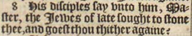 8 His disciples say vnto him, Master, the Iewes of late sought to stone thee, and goest thou thither againe?