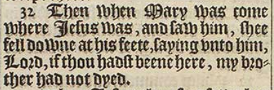 32 Then when Mary was come where Iesus was, and saw him, shee fell downe at his feete, saying vnto him, Lord, if thou hadst beene here, my brother had not dyed.
