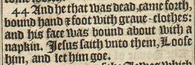 44 And he that was dead, came forth, bound hand & foot with graue-clothes: and his face was bound about with a napkin. Iesus saith vnto them, Loose him, and let him goe.
