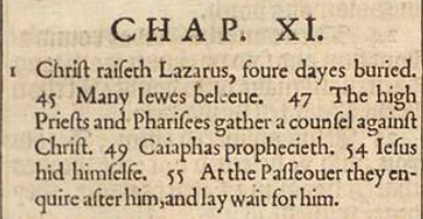 1 Christus erweckt Lazarus, der vier Tage begraben war. 45 Viele Juden glauben. 47 Die Hohepriester und Pharisäer versammeln einen Rat gegen Christus. 49 Kajaphas prophezeit. 54 Jesus verbarg sich. 55 Am Passah erkundigen sie sich nach ihm und lauern ihm auf.