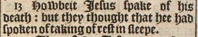 13 Howbeit Iesus spake of his death: but they thought that hee had spoken of taking of rest in sleepe.