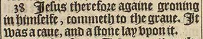 38 Iesus therefore againe groning in himselfe, commeth to the graue. It was a caue, and a stone lay vpon it.