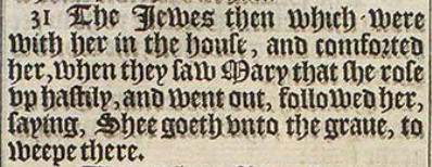 31 The Iewes then which were with her in the house, and comforted her, when they saw Mary that she rose vp hastily, and went out, followed her, saying, Shee goeth vnto the graue, to weepe there.