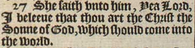 27 She saith vnto him, Yea Lord, I beleeue that thou art the Christ the Sonne of God, which should come into the world.