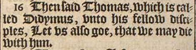 16 Then said Thomas, which is called Didymus, vnto his fellow disciples, Let vs also goe, that we may die with him.
