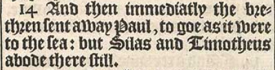 14 And then immediatly the brethren sent away Paul, to goe as it were to the sea: but Silas and Timotheus abode there still.