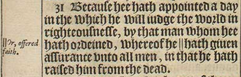 31 Because hee hath appointed a day in the which he will iudge the world in righteousnesse, by that man whom hee hath ordeined, whereof he || hath giuen assurance vnto all men, in that he hath raised him from the dead. [|| Or, offered faith.]