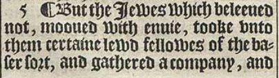 5 ¶ But the Iewes which beleeued not, mooued with enuie, tooke vnto them certaine lewd fellowes of the baser sort, and gathered a company, and set all the citie on an vprore, and assaulted the house of Iason, and sought to bring them out to the people.