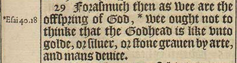 29 Forasmuch then as wee are the offspring of God, *wee ought not to thinke that the Godhead is like vnto golde, or siluer, or stone grauen by arte, and mans deuice.[*Esai 40.18]