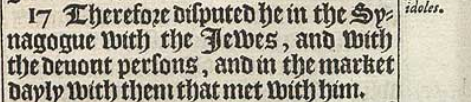 17 Therefore disputed he in the Synagogue with the Iewes, and with the deuout persons, and in the market dayly with them that met with him.