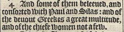 4 And some of them beleeued, and consorted with Paul and Silas: and of the deuout Greekes a great multitude, and of the chiefe women not a few.
