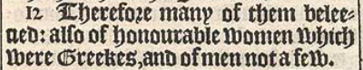 12 Therefore many of them beleeued: also of honourable women which were Greekes, and of men not a few.