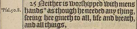 25 Neither is worshipped with mens hands *as though he needed any thing, seeing hee giueth to all, life and breath, and all things, [*Psal.50.8.]