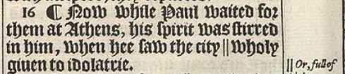 16 ¶ Now while Paul waited for them at Athens, his spirit was stirred in him, when hee saw the city || wholy giuen to idolatrie. [|| Or, full of idoles.]