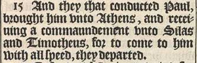 15 And they that conducted Paul, brought him vnto Athens, and receiuing a commaundement vnto Silas and Timotheus, for to come to him with all speed, they departed.