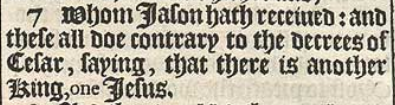 7 Whom Iason hath receiued: and these all doe contrary to the decrees of Cesar, saying, that there is another King, one Iesus.