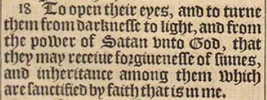 18 To open their eyes, and to turne them from darknesse to light, and from the power of Satan vnto God, that they may receiue forgiuenesse of sinnes, and inheritance among them which are sanctified by faith that is in me.