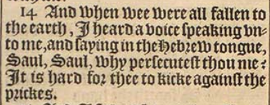 14 And when wee were all fallen to the earth, I heard a voice speaking vnto me, and saying in the Hebrew tongue, Saul, Saul, why persecutest thou me? It is hard for thee to kicke against the prickes.