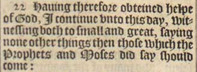 22 Hauing therefore obteined helpe of God, I continue vnto this day, witnessing both to small and great, saying none other things then those which the Prophets and Moses did say should come: