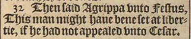 32 Then said Agrippa vnto Festus, This man might haue bene set at libertie, if he had not appealed vnto Cesar.